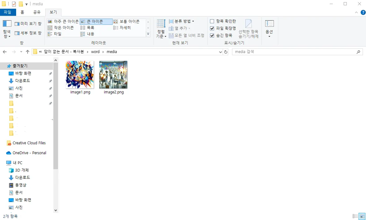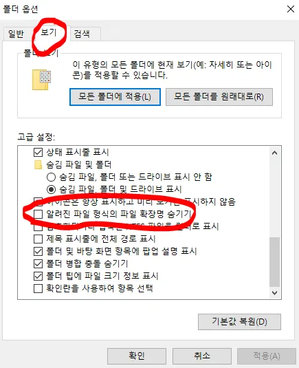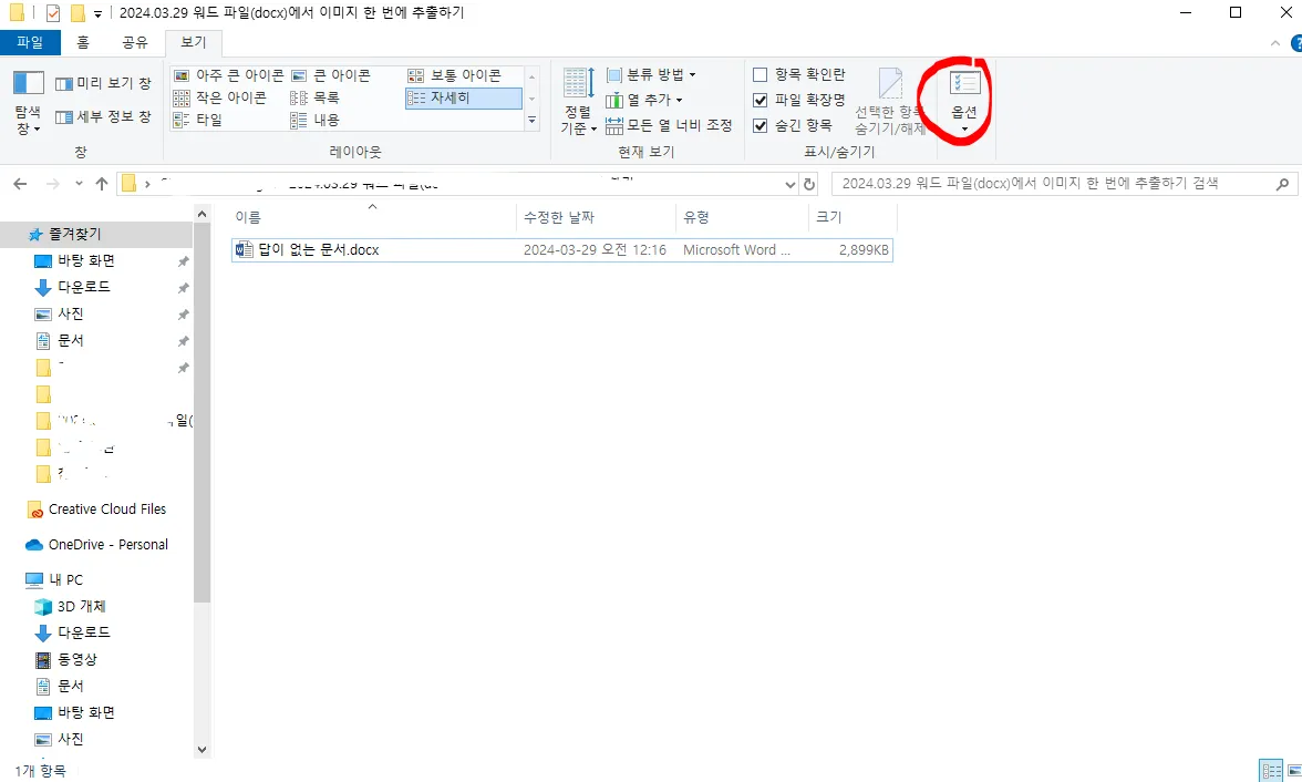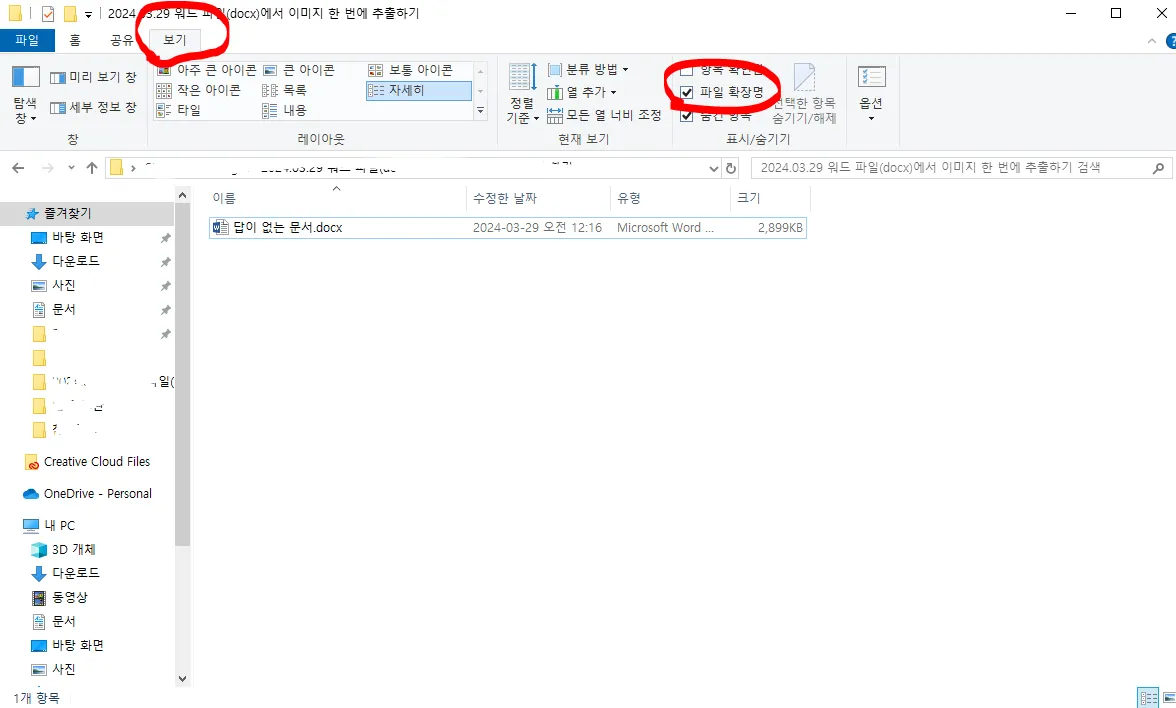 만약 폴더에서 “.docx”와 같은 확장자명이 보이지 않는 경우 폴더 설정에서 확장자명을 보이게 할 수 있습니다