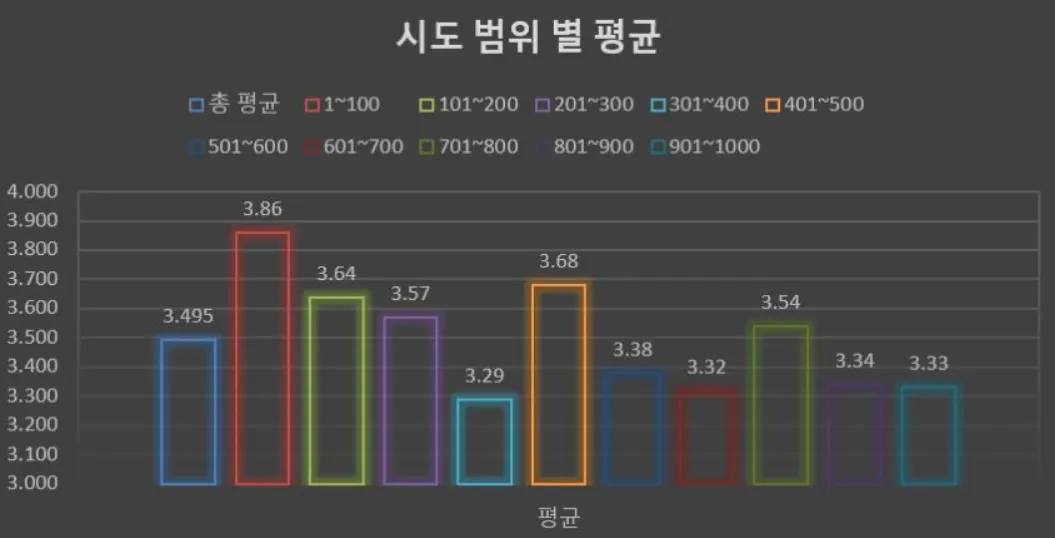 각 10번의 시행 구간 별(주사위 10개x10번=총 100개의 눈) 평균은 다음과 같다.